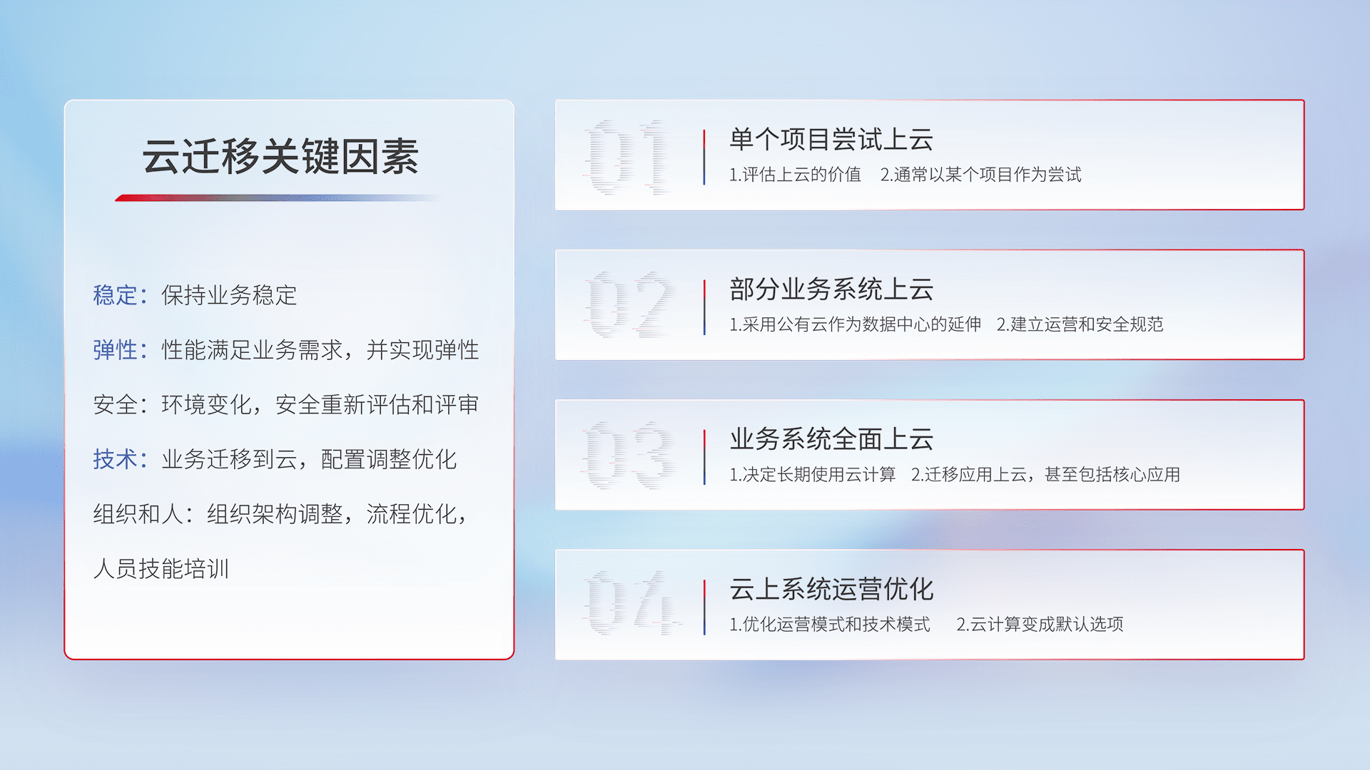 结合实际业务,,,从规划设计、、、、云平台选型、、、、云原生改造、、数据迁移、、、集成交付,,,迁移全过程为客户识别最佳上云路径,,做好风险识别管理,,,,设计网络架构、、、、身份权限、、、安全审计合规、、操作审计、、、、日志审计、、、、监控告警策略、、多站点容灾设计等,,,,对云上基础设施进行整体规划,,提升IT治理水平,,,以满足弹性、、、、高可用、、、高性能的需求。。。