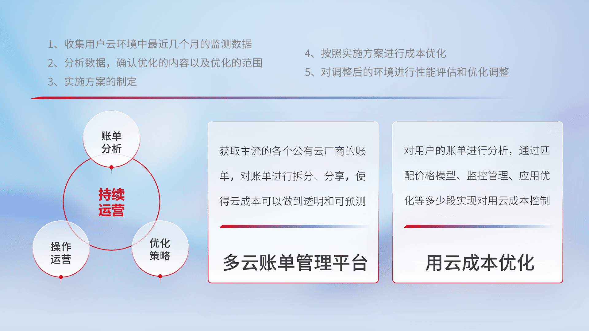 通过多云纳管,,,以统一的资源数据模型把客户的云资源进行抽象和封装,,进而实现对多云资源的统一操作,,保障云资源管理的可靠性、、、、稳定性与可用性。。量身定制化运维内容,,配置、、、开发运维、、补丁管理、、、备份、、监控、、、认证和访问管理、、、审计和日常巡检等,,,保障在用云过程中的可靠度,,,,稳定度以及高可用率。。
